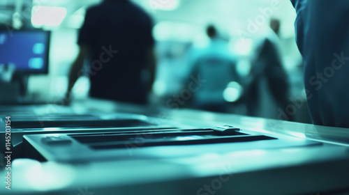 Crowded airport security checkpoint with travelers waiting in line, bags and personal items being scanned. Efficient travel and safety measures in modern transportation hubs.