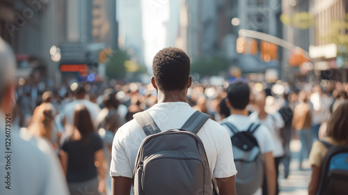 Crowded city street at dusk, young explorer with a backpack navigating through