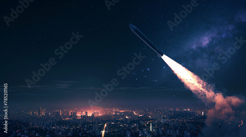 Cruise Missile Flight at Twilight Over Ocean Missile in Night Sky Over Illuminated Cityscape Nighttime Missile Launch with Urban Backdrop