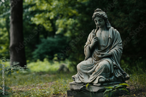 Crumbling statue of prosperity sits silently in a deserted park surrounded by lush greenery and overgrown grass