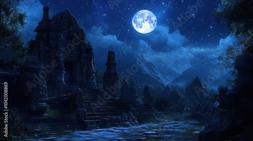 Crumbling temple in moonlight stars overhead long shadows creating a mystical allure