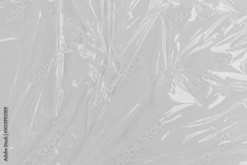 Crumpled shiny and transparent plastic wrap for food packaging or environmental waste concepts in stock photos and designs.