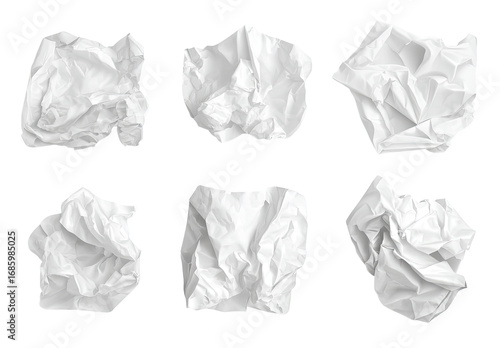 Crumpled white paper pieces, close-up. A collection of eight crumpled sheets of white paper, isolated on black background. Each piece displays unique crinkles and folds