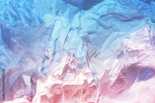 Crumpled white paper texture enlightened with two colored lights pink and blue. Flat lay.