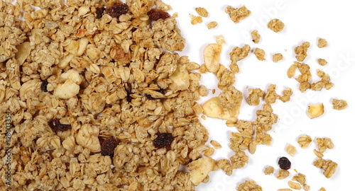 Crunchy granola, muesli pile with banana, pineapple slices, peanuts and raisins isolated on white background, top view