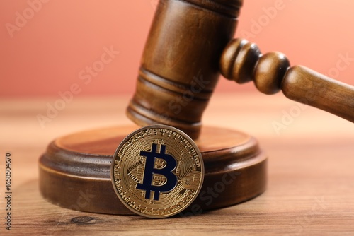 Cryptocurrency. Bitcoin and judge's gavel on wooden table, closeup