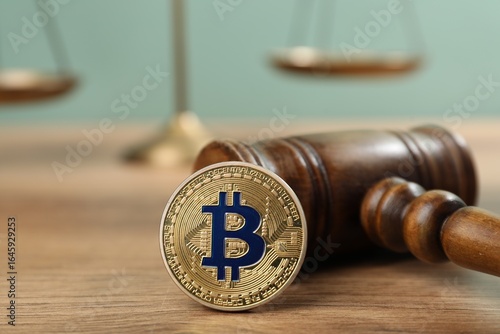 Cryptocurrency. Bitcoin, judge's gavel and scales on wooden table, closeup