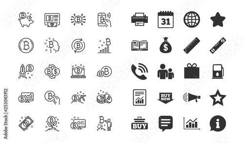 Cryptocurrency line icons. Set of Blockchain, Crypto ICO start up and Bitcoin linear icons. Mining, Cryptocurrency exchange and gold pickaxe symbols. Bitcoin ATM, crypto coins and financial markets
