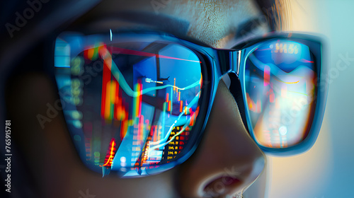 Cryptocurrency trading, stock market trading graphs reflected in a person's glasses design concept, copy space