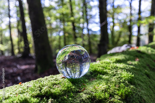 Crystal ball sitting on the moss in the woods
