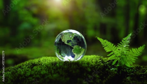 Crystal clear glass Earth globe resting on lush green moss and surrounded by ferns in a vibrant forest, symbolizing sustainability and global environmental conservation