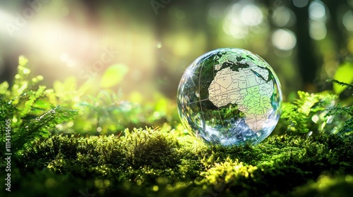 Crystal clear glass globe resting on vibrant green moss nature scene gigapixel quality forest environment artistic viewpoint