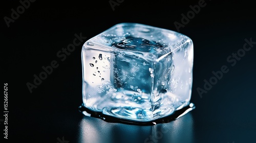 Crystal clear ice cube melting on reflective surface, with water droplets clinging to its sides