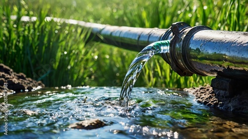 Crystal Clear Stream Gushing From Metal Pipe Amidst Green Grass in Agricultural Field During Sunny Day
