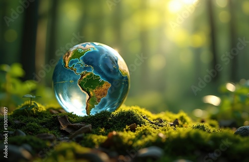 Crystal glass globe on moss in forest. Earth model reflects green nature trees, eco concept. Transparent sphere ball on mossy ground. Symbolizes world eco awareness.