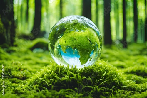 Crystal globe glass on green moss in forest to protect nature Save and care World for sustainable. concept of the environment ecology and Earth Day. eco environment