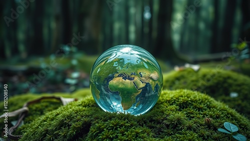 Crystal globe glass on green moss in forest to protect nature Save and care World for sustainable. concept of the environment ecology and Earth Day. eco environment and ESG concept