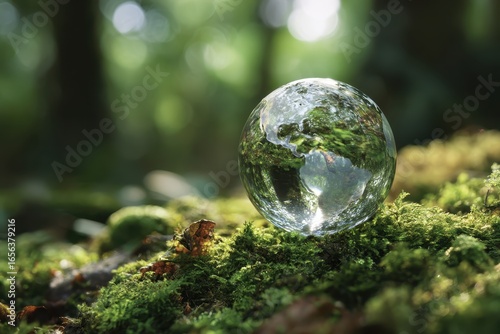 Crystal globe glass on green moss in forest to protect nature Save and care World for sustainable. concept of the environment ecology and Earth Day. eco environment and ESG concept