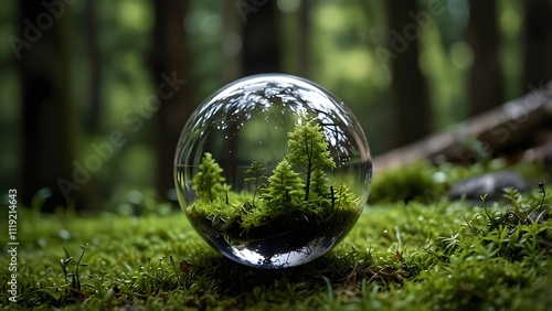 Crystal globe glass on green moss in forest to protect nature Save and care World for sustainable. concept of the environment ecology and Earth Day. eco environment and ESG concept.. See Less