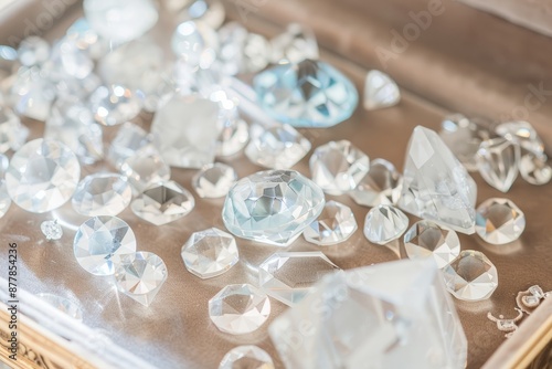 Crystal-clear gemstones scattered across a velvet-lined jewelry box, each one catching the light in a dazzling display, Generative AI