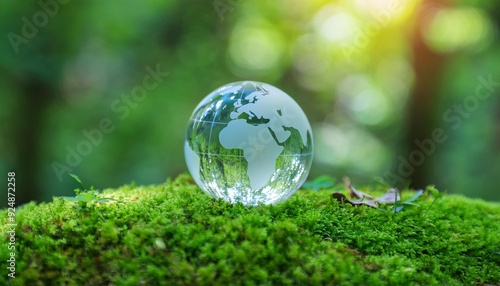 crystal-clear glass globe representing the Earth, symbolizing the Environmental, Social, and Governance (ESG) concept and Sustainable Development Goals (SDGs), sits gracefully on a lush green surface,