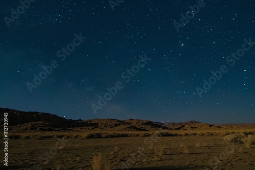 Crystal-clear night sky over desert landscape .A serene night sky filled with stars above rugged mountains and a vast desert landscape, creating a tranquil atmosphere.