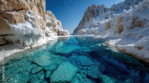 Crystal-clear turquoise water flows between snow-covered rocky cliffs under a bright blue sky in a frozen mountain landscape.