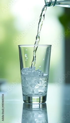 Crystal-clear water pouring into a glass with ice cubes on a reflective surface, captured in natural light with a soft green-white blurred outdoor background.