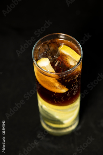 Cuba Libre cocktail with rum, coke and lime juice with lime wedge and full of ices