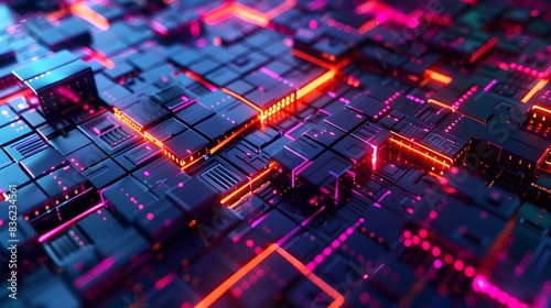 Cubic lattice with metallic textures and glowing circuits, close up, cybernetic design, vibrant, manipulation, cyberpunk city backdrop