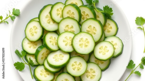 Cucumber slices garnishing white plate, fresh parsley sprinkled, presenting clean culinary composition with minimalist styling