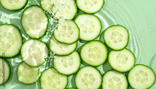 Cucumber slices splash into water. Crisp and hydrating — perfect for wellness or freshness visuals.