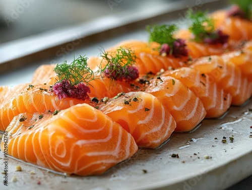 Culinary Artistry: Exquisite Salmon Cubes Adorned with Vibrant Garnishes in a Fusion of Flavor and Visual Delight