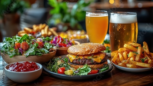 Culinary Extravaganza: An eye-level view of a luscious spread, showcasing a perfectly stacked hamburger, accompanied by golden-fried potatoes, a vibrant green salad.
