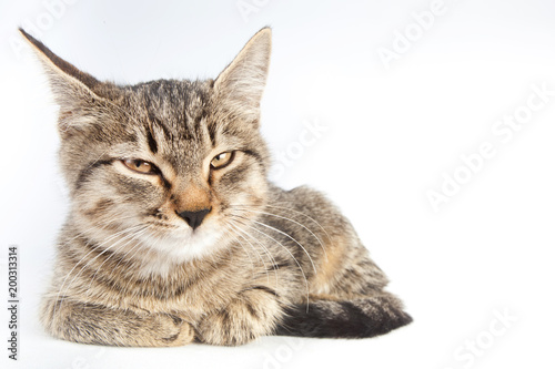 cunning tabby cat is screwed up his eyes