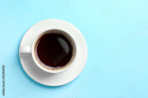 Cup of aromatic coffee on light blue background, top view. Space for text