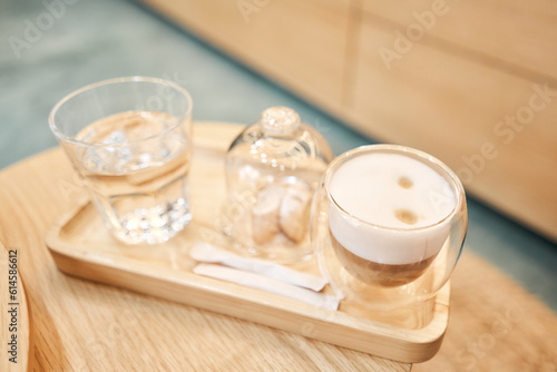 Cup of coffee cappuccino with cantuccini and a glass of water on a wooden tray. Coffee with milk, a cookie and a glass with water on a glass table.