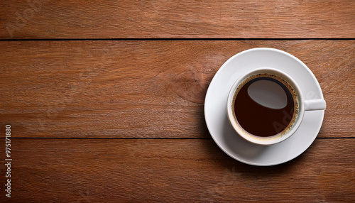 Cup of coffee on a wood table background. Top view with copy space
