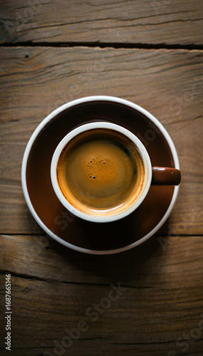 Cup of coffee on wooden table with saucer and spoon