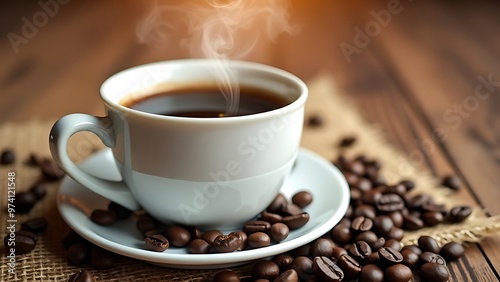 Cup of coffee with steam rising in a heart shape, surrounded by coffee beans on a burlap surface.