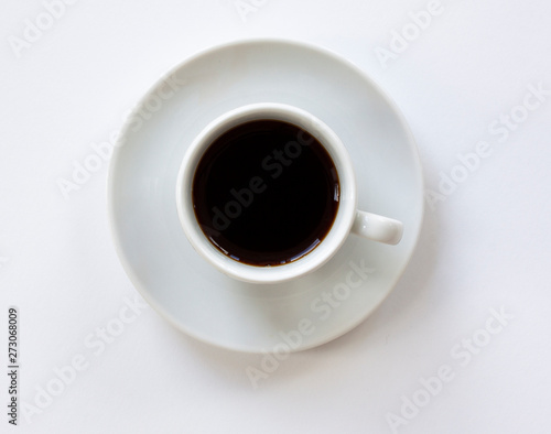Cup of espresso coffee with saucer on white background. Top view. Close up image.