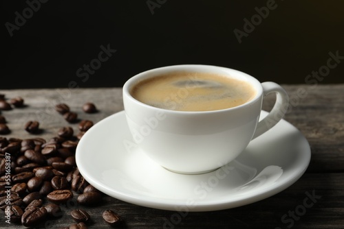 Cup of hot aromatic coffee and roasted beans on wooden table against dark background