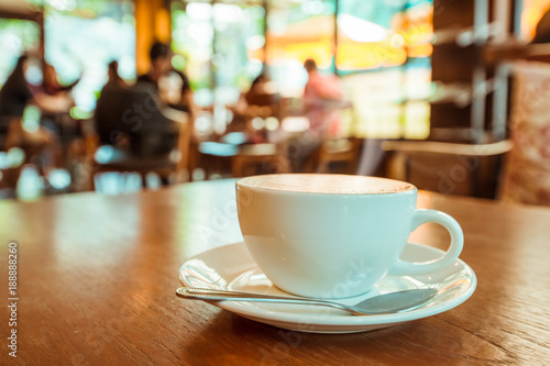 Cup of hot coffee on table in cafe with people. vintage and retro color effect - shallow depth of field