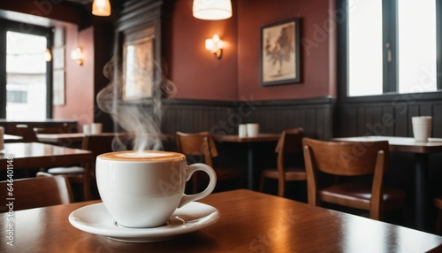 cup of hot coffee with cozy coffeehouse restaurant background, created using AI generative technology