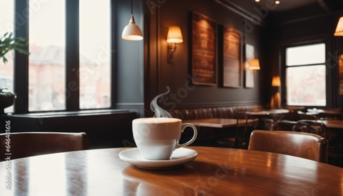 cup of hot coffee with cozy coffeehouse restaurant background, created using AI generative technology