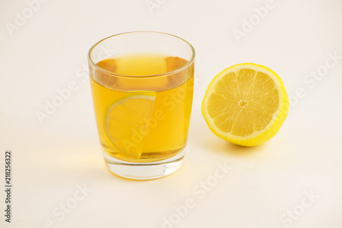 Cup of hot tea with lemon slice on a white background. Glass of ice tea with lemon. Healthy lifestyle.