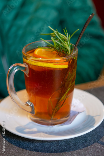 Cup of winter hot tea with fresh citrus fruits and rosemary
