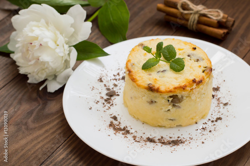 Curd pudding with raisins. Wooden rustic table. Close-up. Top view