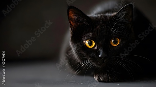 Curious black cat observing quietly with shimmering eyes. National Black Cat Day, resilience and raises awareness for their adoption
