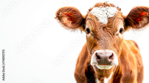 Curious Brown and White Cow Staring Forward Against a Blank Background